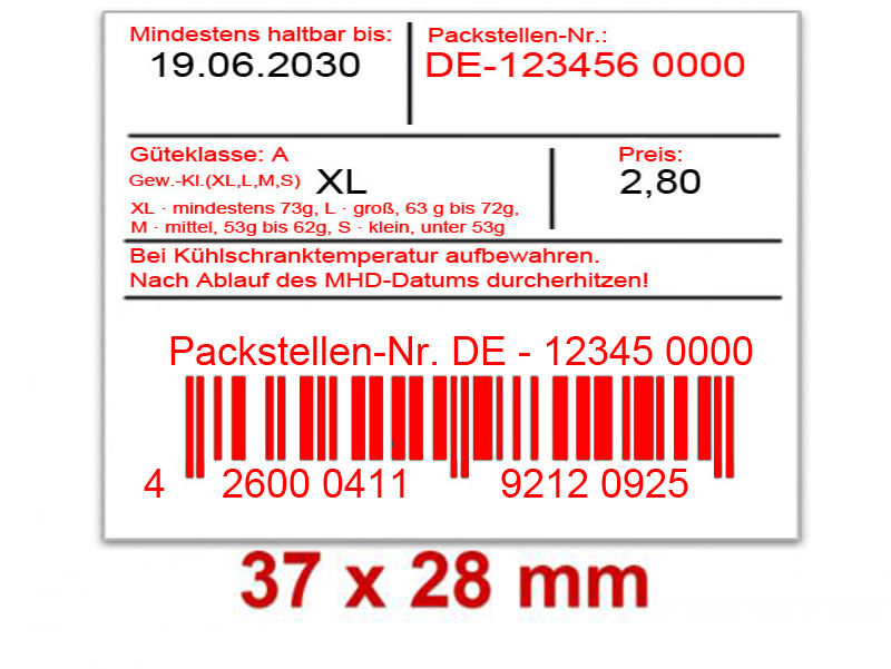 Etiketten in der Größe 37 × 28 mm sind für die Verkaufsverpackung auf Eierschachteln erhältlich.