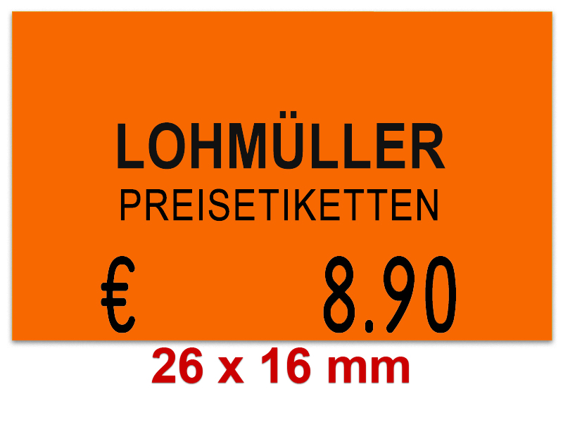 Preisetiketten 26 × 16 mm, rechteckig, Standard- und Leuchtfarben, mit einem Firmenschriftzug.